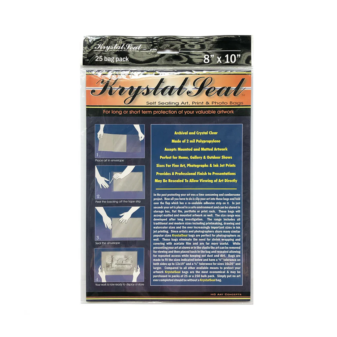 Krystal Seal offers self-sealing art, print, and photo bags that revolutionize the way art is protected, making it quick and effortless. Gone are the days of time-consuming and cumbersome art protection—simply slip the artwork into Krystal Seal bags and fold over the flap with its resealable adhesive strip. In seconds, the art is secured in a safe environment, ready for storage in a flat file, portfolio, storage box, or print rack. Krystal Seal bags are archival, crystal clear, and designed to accommodate mounted and matted artwork. Ideal for home, gallery, and outdoor shows, these bags come in sizes perfect for fine art, photographs, and inkjet prints, providing a professional finish to presentations. The resealable feature allows for easy viewing of the art, making Krystal Seal the ultimate solution for artists and collectors alike.