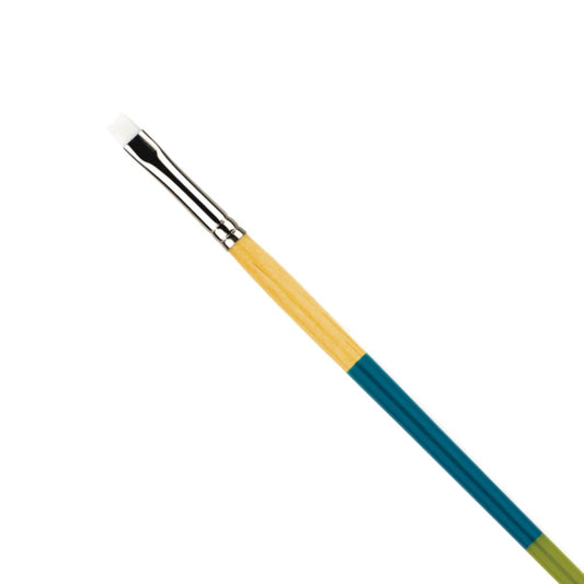 The flat brush features a straight, rectangular edge that makes it incredibly versatile for various painting techniques. Its design allows artists to create both thin and broad brushstrokes with simple adjustments in pressure and angle.