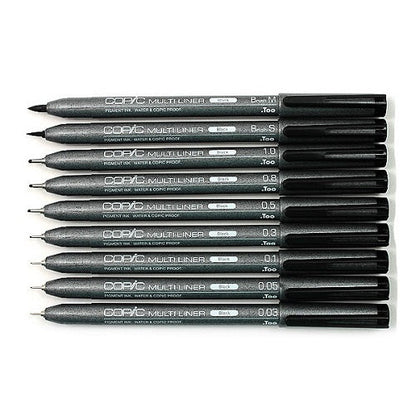 • Black multiliners are available in 0.03, 0.05, 0.1, 0.3, 0.5, 0.8, 1.0mm and in Brush Small (BS) and Brush Medium (BM)