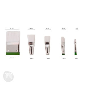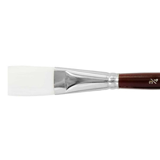 The flat brush features a straight, rectangular edge that makes it incredibly versatile for various painting techniques. Its design allows artists to create both thin and broad brushstrokes with simple adjustments in pressure and angle.