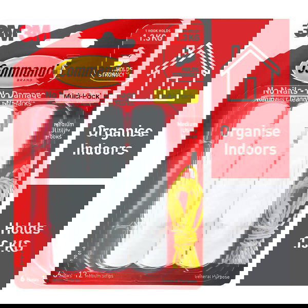 This Command Medium Hooks Value Pack is great when you have multiple items to hang. Each hook holds up to 1.3 kg so you can use them for bags, suspending files from hooks using metal rings, hanging up clothes and more.