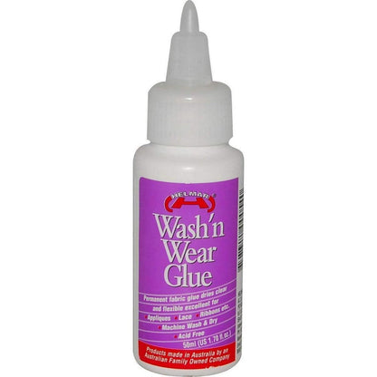 • Helmar Wash 'n Wear glue is a water based glue for permanently adhering, appliques, ribbon, lace, fabric cutouts, etc to various types of garments. It dries clear and flexible, although it may be seen on thin