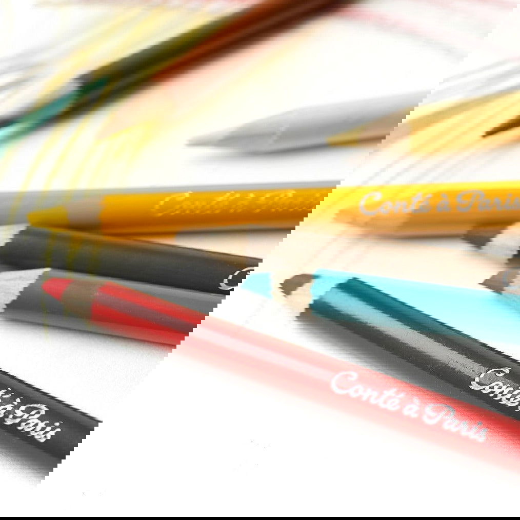 The exceptional 5mm diameter of the Conté à Paris pastel pencil lead gives genuine freedom of creation and has an unrivaled feel. The pastel is a perfect pencil companion to soft pastel because it's lead is slightly harder with less pigment. It is preferable to Conté soft pastels and crayons when detail is required for small and medium sized formats. In contrast with soft pastel, pastel pencil should not be added in successive layers of colours, but used as pure colours laid out in patchwork fashion side by side (so as not to dull the shades).