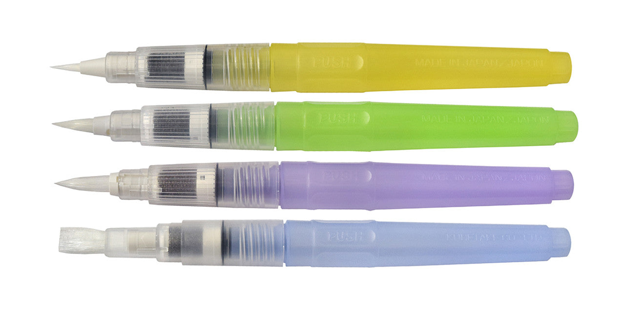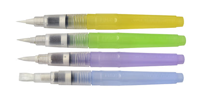 The ZIG Waterbrush Set 4pc is a versatile set of empty ZIG Waterbrushes. Fill with plain water to blend water-soluble media; or fill with dilute watercolour, ink, etc for sketching or area filling. To fill, unscrew tip and place neck of barrel in water. Squeeze and release to fill.
