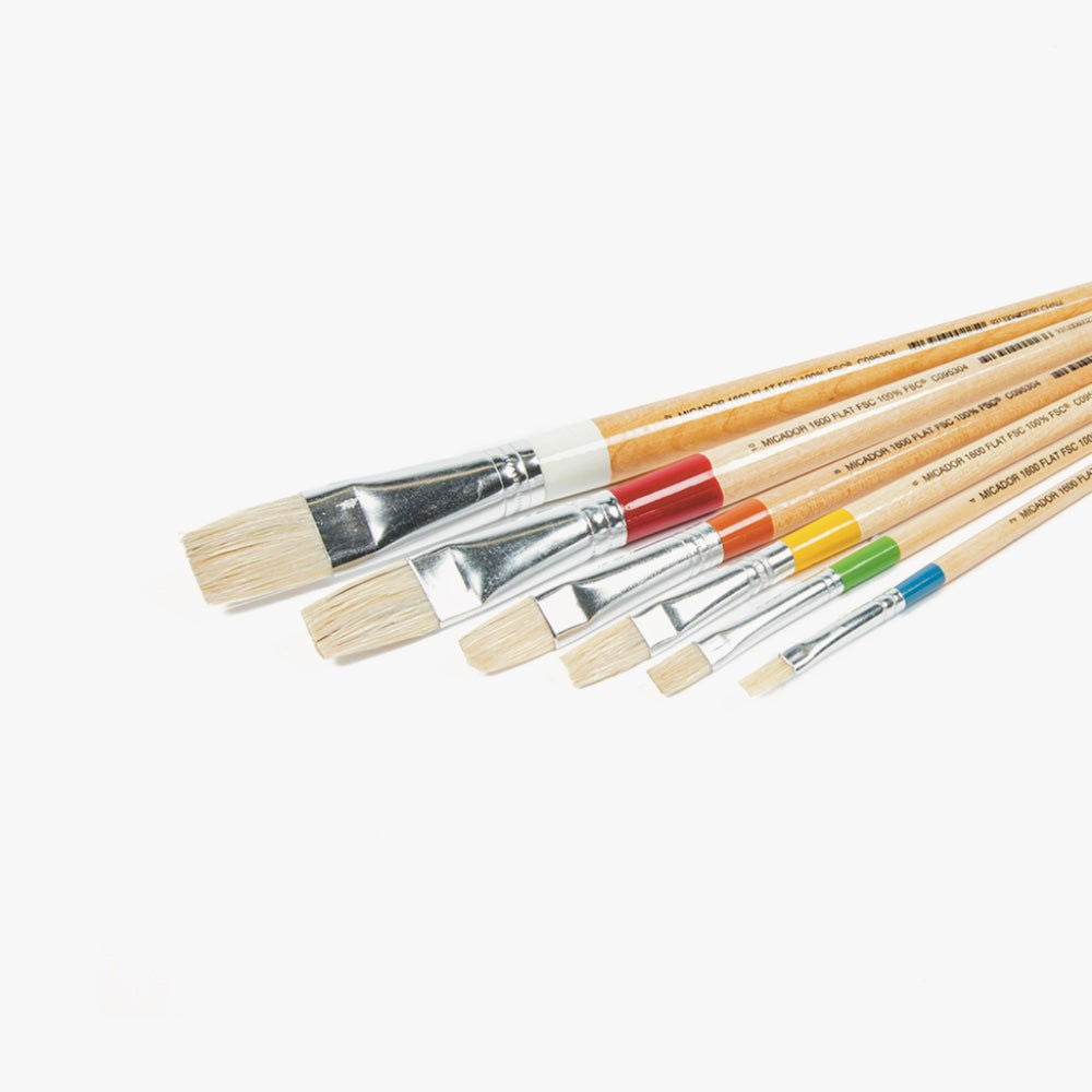 The 1600F Micador Flat Hog Brush is a kids favourite, these brushes have been taken to the next level! With colour coded rings to distinguish the sizes, it's now even easier for someone to find the right size brush. These brushes are best selling, economical all-purpose round brush for students and beginner painters. The brushes can be used for oil, acrylic, poster colour and general-purpose work.