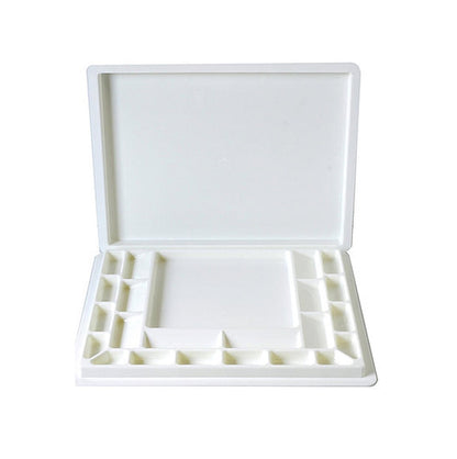 This 12 × 16" covered palette made of heavyweight resin plastic also includes a central mixing area measuring 8¼" × 7¼" × ¼" deep and a lid that also can be used for mixing.