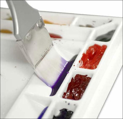 The large glazing wells are ideal for mixing and storing a large quantity of colour that remains uncontaminated by other colours. This eliminates the need to stop in the middle of a wash and attempt to mix more colour that may or may not be the same as the original colour. When painting large, these glazing wells make working faster uniquely possible. The center mixing areas provide ample space for completing pictures without cleanup and without the need to stop and remix.
