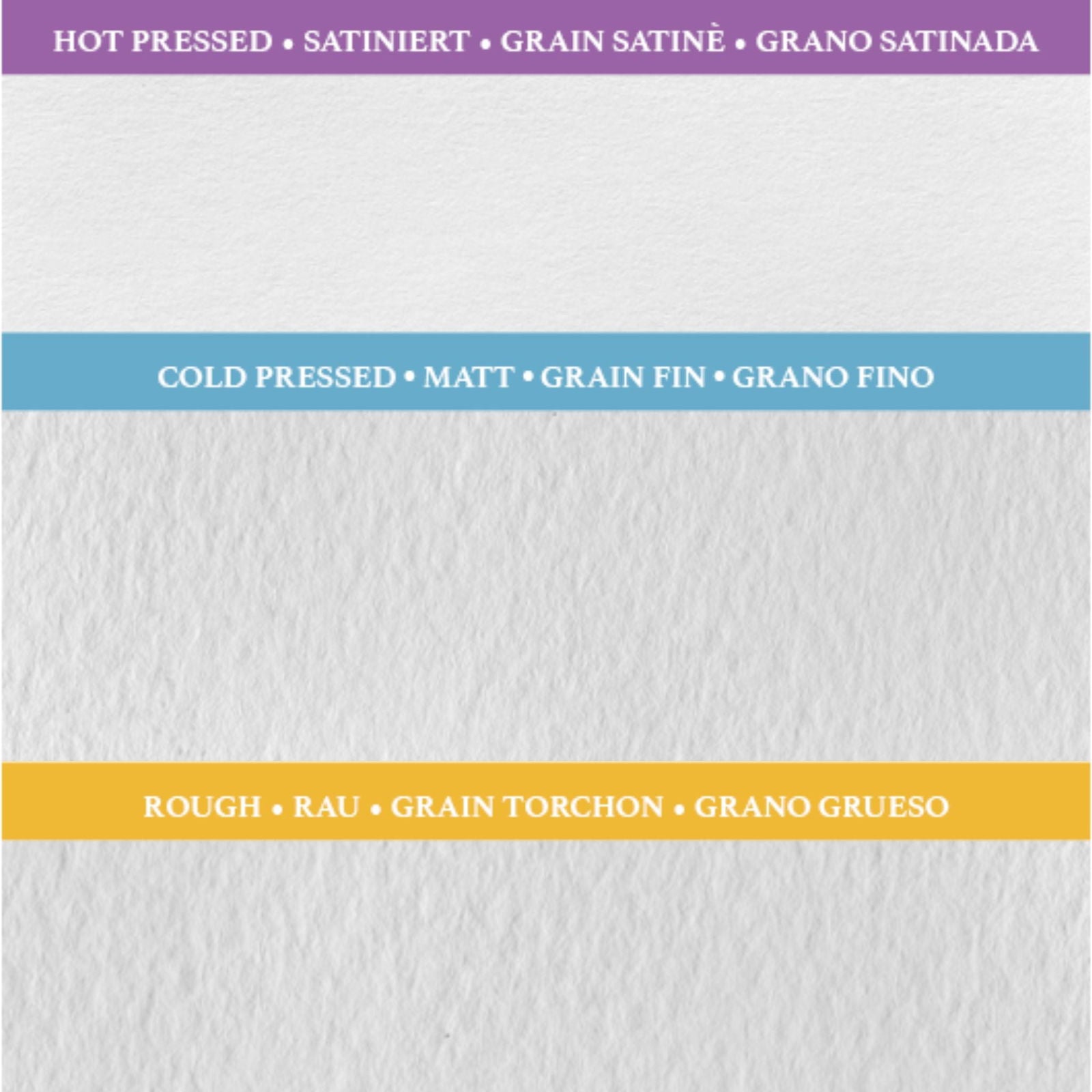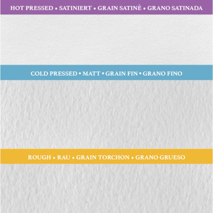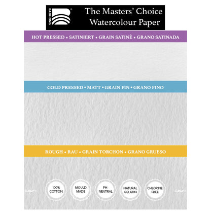 The Masters’ Choice Watercolour 300 grams paper is available in Hot Pressed, Cold Pressed and Rough textures in full size 56x76cm sheets with Deckle Edges as well as in ½ size and ¼ size sheets and 8 block sizes ranging from 12.5 x 18 cm to 46 x 61 cm.