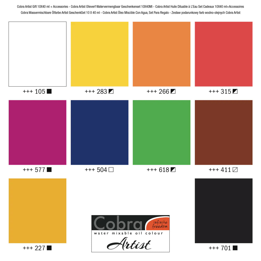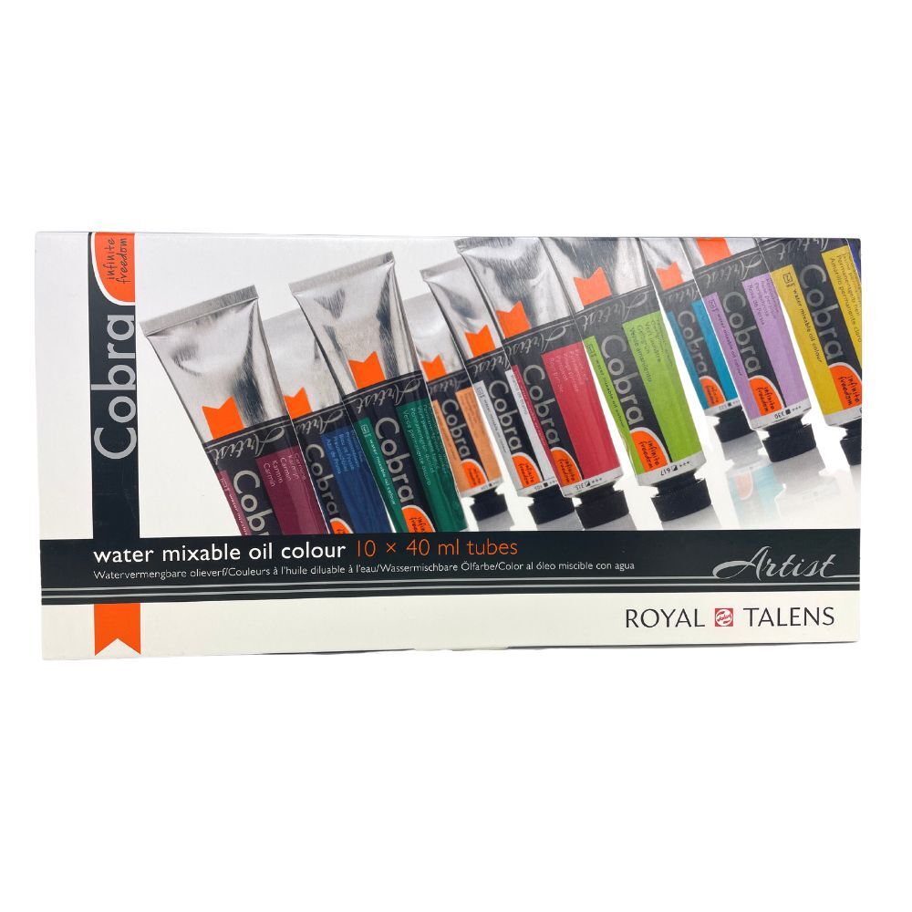 10 x 40ml contains: Titanium White, Permanent Yellow Light, Permanent Orange, Pyrrole Red, Permanent Red Violet Light, Ultramarine, Permanent Green Deep, Burnt Sienna, Yellow Ochre, and Ivory Black