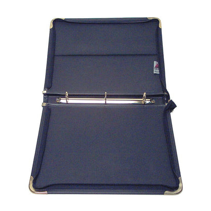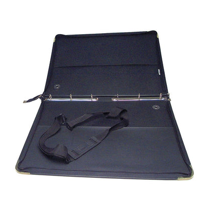Heavily embossed PVC over board covers with fabric backed metal zip and shoulder strap. Brassed ring metals and protective