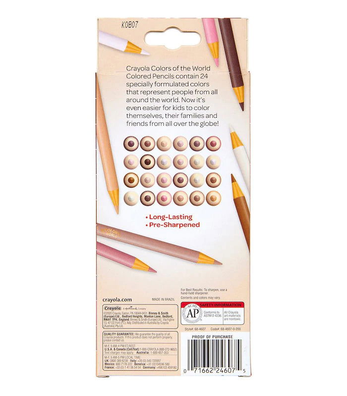 These Crayola Colours of the World Pencils consist of 24 specially-formulated colours representing people of the world. These skintone pencils are an exciting addition to your collection at home or in the classroom, making colouring pages and drawings even more detailed and realistic. These pencils are non-toxic.