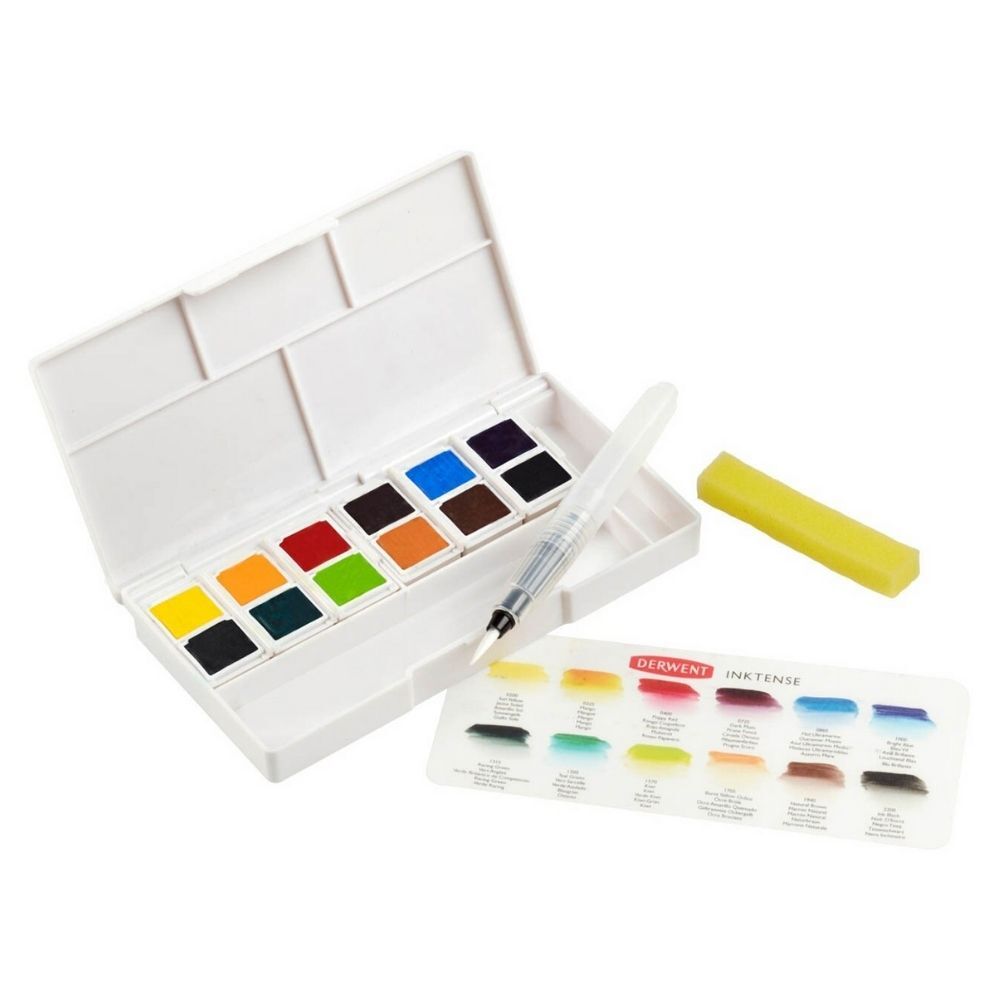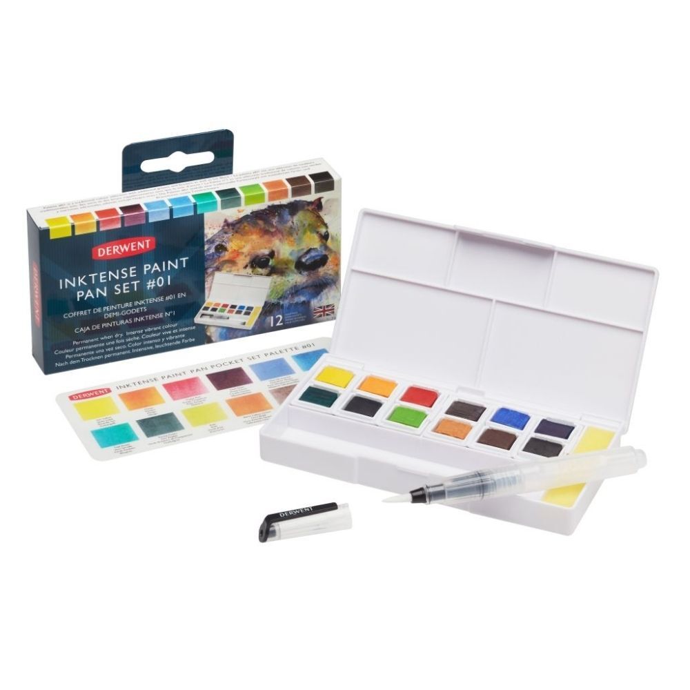 The Derwent Inktense Paint Pan Sets contains the unique Inktense formulation found in the Derwent Inktense pencil and block ranges. Unlike traditional water colour, washes of vivid paint can be applied without dissolving previously dried layers.