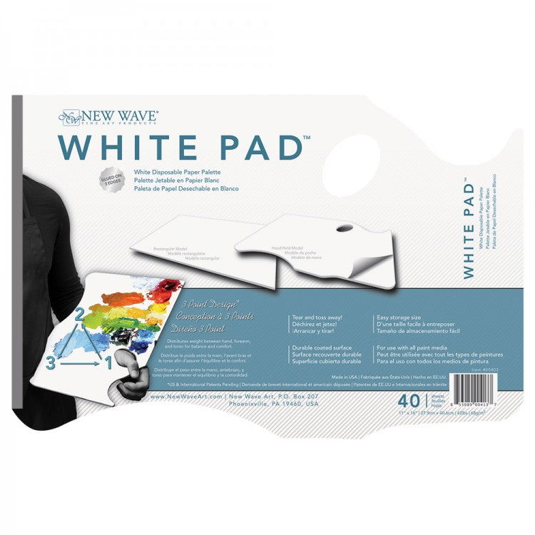 Designed with the artist in mind, the White Pad raises the bar! The disposable paper palette contains 40 white sheets of extremely durable paper stock that are coated to make certain the sheets beneath stay dry. In addition, the pad is glued on 3 edges, ensuring that your pages stay fastened while you mix paint. It also ensures that your pages do not blow in the wind if painting outdoors. Ideal for all paint media, the White Pad hand held model provides you with a patent pending ergonomic design that evenly distributes the weight among your hand, arm, and torso for complete comfort if held. The size is 11"x 16" for easy storage and transportation. Made in the USA.