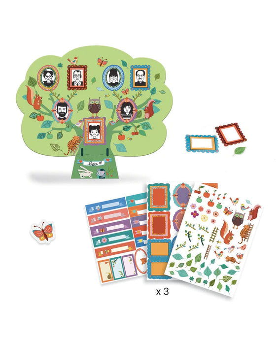 Contents: 1 cardboard tree with trunk to be assembled, 2 sheets of reusable stickers, and 1 sheet of paper stickers.