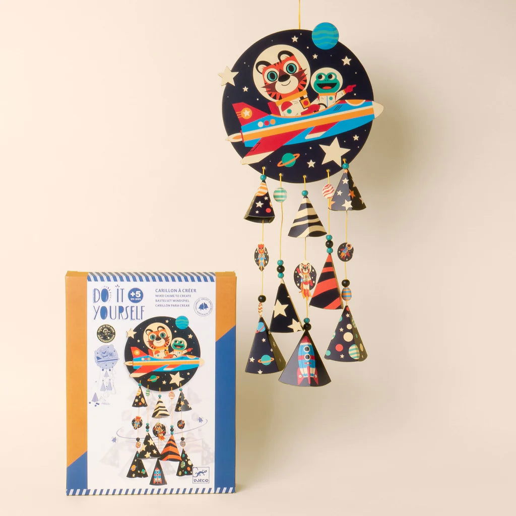 Children will enjoy building this wind chime with a space theme. Bells, wooden beads, and illustrated cones are strung on the waxed cotton threads that attach to the supplied stand. When you move the threads, the chime jingles sweetly. Designed with fluorescent ink, the chime glows in the dark. This is an FSC-certified product.