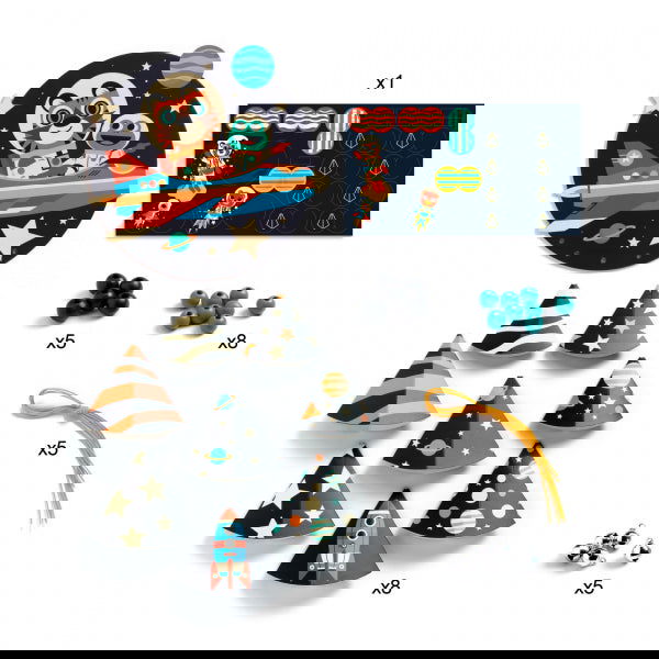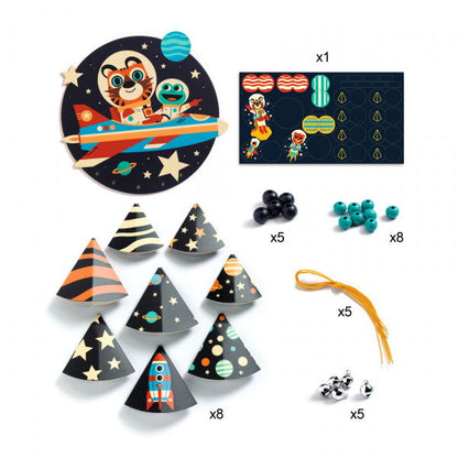 Contents: 8 cones, 1 assortment of coloured wooden beads, 5 waxed cotton threads, 5 bells, and 1 sheet of stickers.