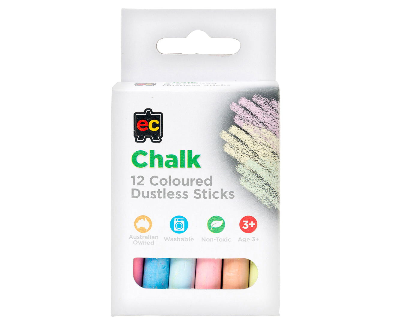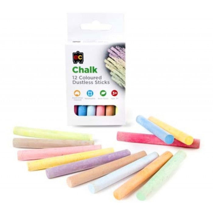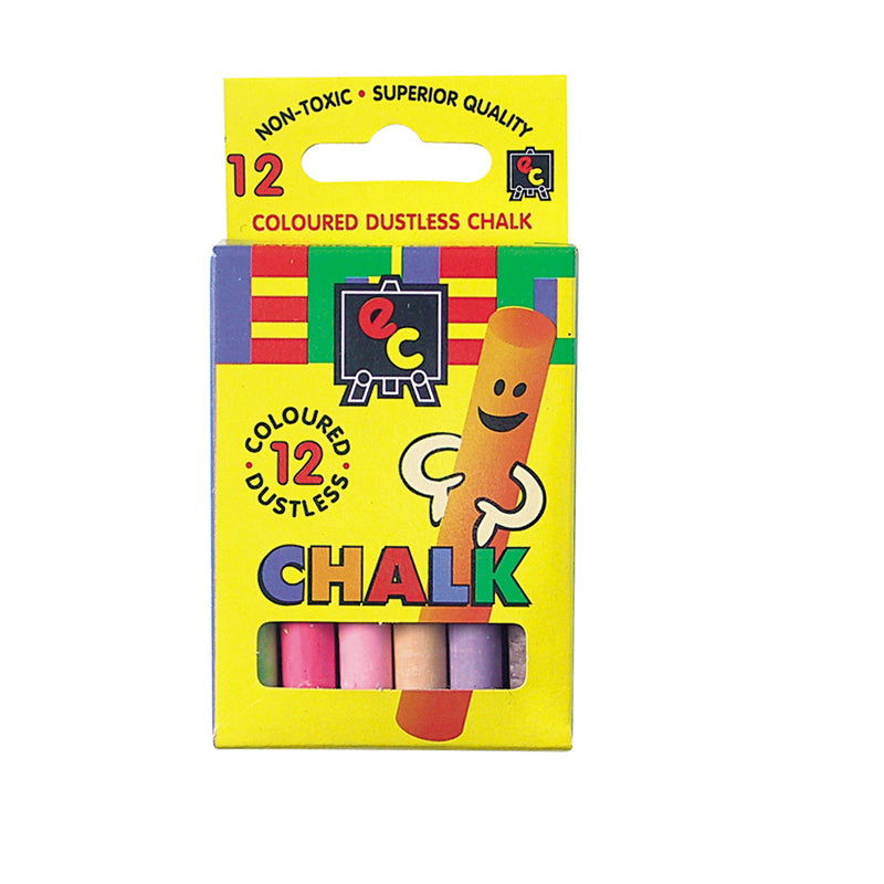 12 sticks of coloured, dustless chalk. Assorted colours. Non-toxic.