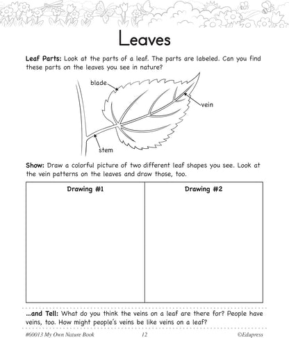 My Own Nature Book gives young explorers a place to think about, write about, and draw the many fascinating sights, sounds, and experiences they can find in nature. Each two-page section prompts students to observe a specific part of nature and then journal about their observations. A ready-to-color cover adds to the fun. 32 pages, 8½" x 7".
