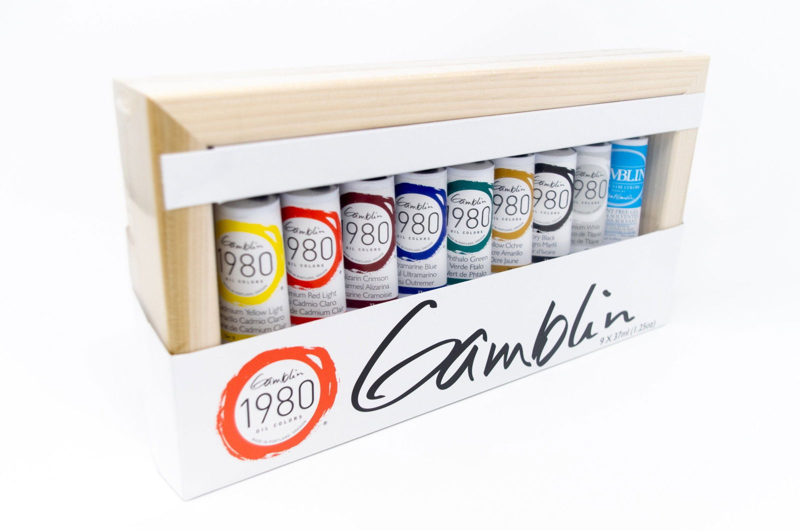 Gamblin Oils Introductory Set has 8x37ml tubes, a Solvent- Free Gel Medium & a primed, handcrafted panel made from sustainably forested North American birch.