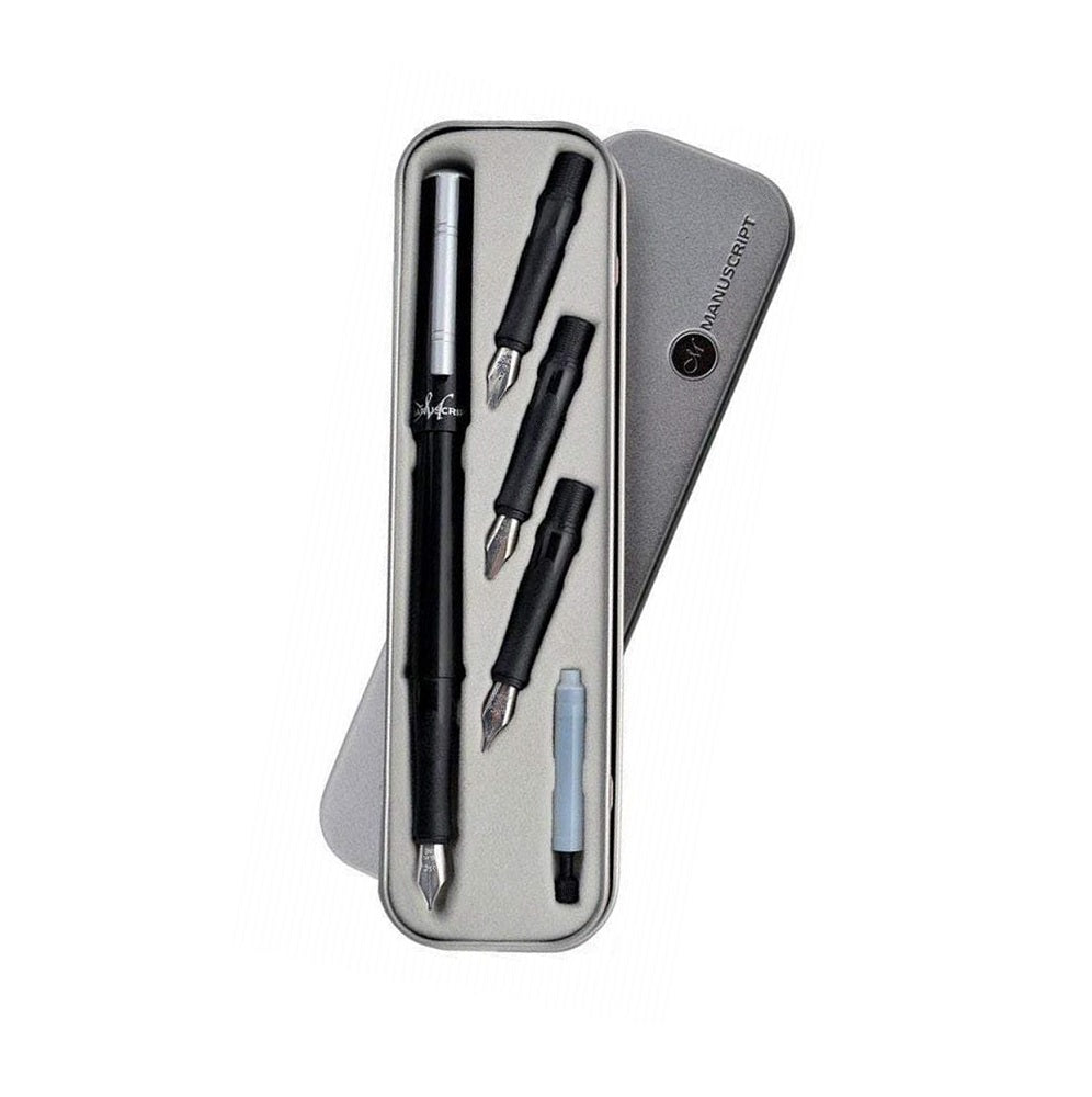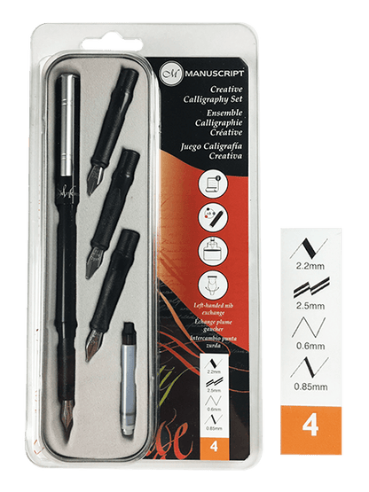 This Creative Calligraphy set offers 4 varieties of quality Nibs: Extra Fine (0,6 mm), Fine (0.85 mm), 3B (2.2 mm) and Scr4 (2.5 mm); that allow you to experiment with font sizes, styles and colour.