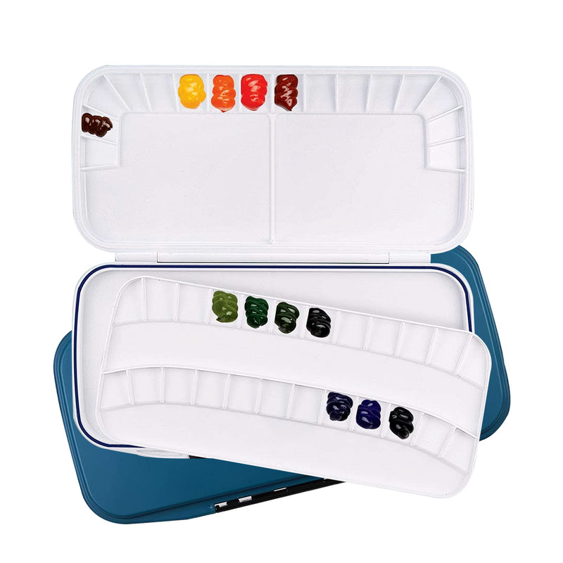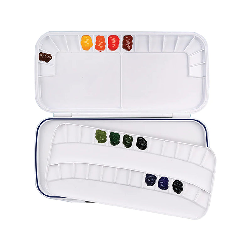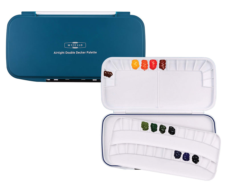 Mijello Airtight Double Decker Watercolor Palette is a smart design airtight palette, designed by an Artist for Artists. This two piece Mijello Peel-Off Tray Palette will keep your paint fresh for days or weeks and due to a special impact plastic. When paint dries, it can be easily cleaned by peeling off the dry paint or wiped off. Thin layers of oils just wipe away with wet cloth and acrylics just peel away.