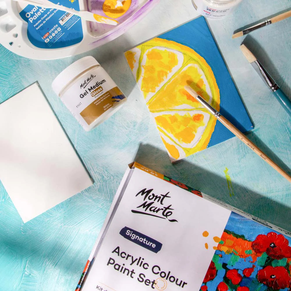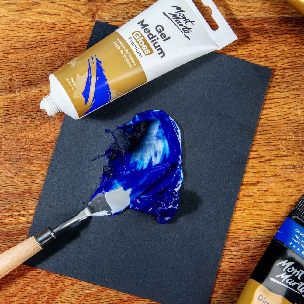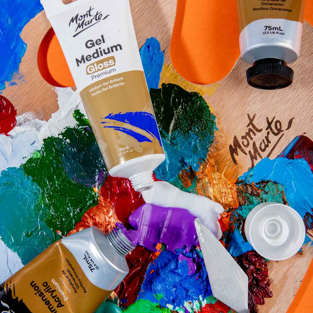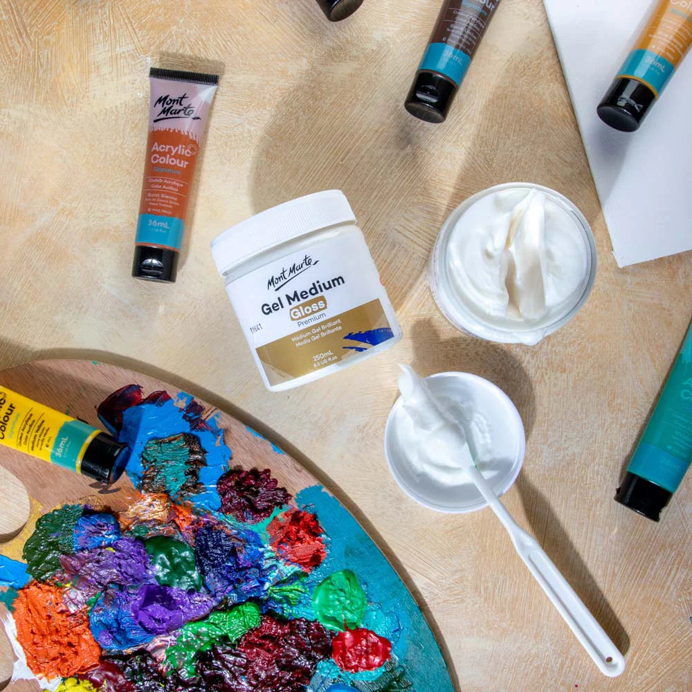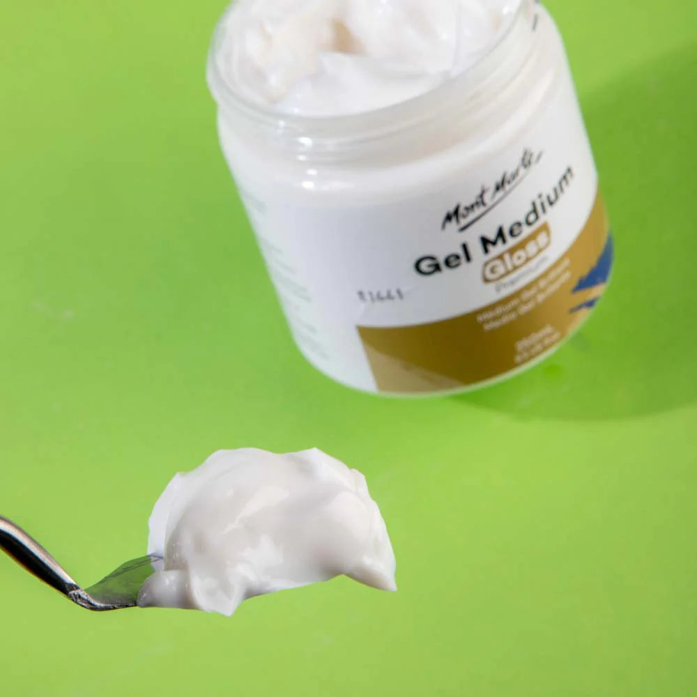 Mont Marte Gel Medium Gloss is used to increase transparency and add gloss when added to your acrylic paint.