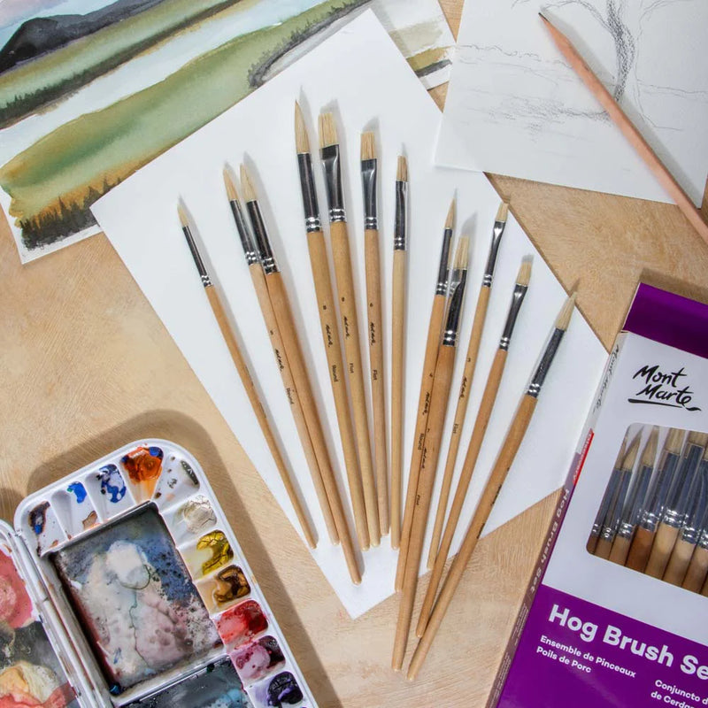 If you’re starting out and looking to add to your brush collection, our Hog Brush Set Round and Flat has you covered. Inside this assorted paint brush set are 12 round and flat paint brushes, ideal for thick to medium strokes or angled, broad and fine strokes.