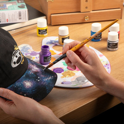 Add some shine to your DIY fashion and homewares with Mont Marte's Metallic Fabric Paints. Choose from 8 shimmery fabric paint shades to level up your clothes, textiles, fabric shoes, accessories, and more! You can mix the colours together for a bigger palette and use them alongside our standard textile paint range for unique artwork. Be your own designer and try applying with a brush, foam applicator, stencil, or screen printing.