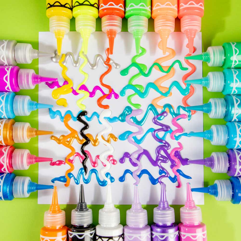 - Includes 24 colours: Titanium White, Lemon Yellow, Orange Yellow, Vermilion, Pink, Light Purple, Purple, Primary Blue, Cerulean Blue, Turquoise, Pale Green, Lamp Black, Fluoro Yellow, Fluoro Orange, Fluoro Pink, Fluoro Purple, Fluoro Blue, Fluoro Green, Gold, Silver, Metallic Hot Pink, Metallic Purple, Metallic Bright Blue, Metallic Turquoise