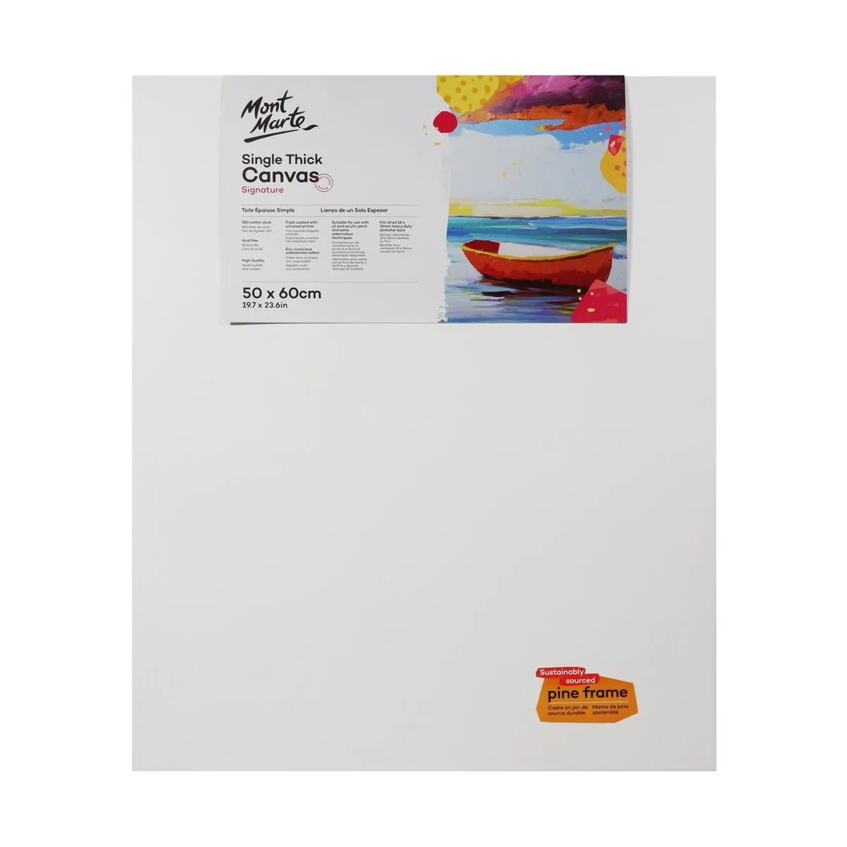 Mont Marte Signature Single Thick Canvases are ideal for those beginning in the practice of art. These canvases are back stapled for a clean edge look. Suitable for light applications of paint. The Environmentally friendly cotton duck canvas is triple acrylic titanium primed and ready to be painted on.