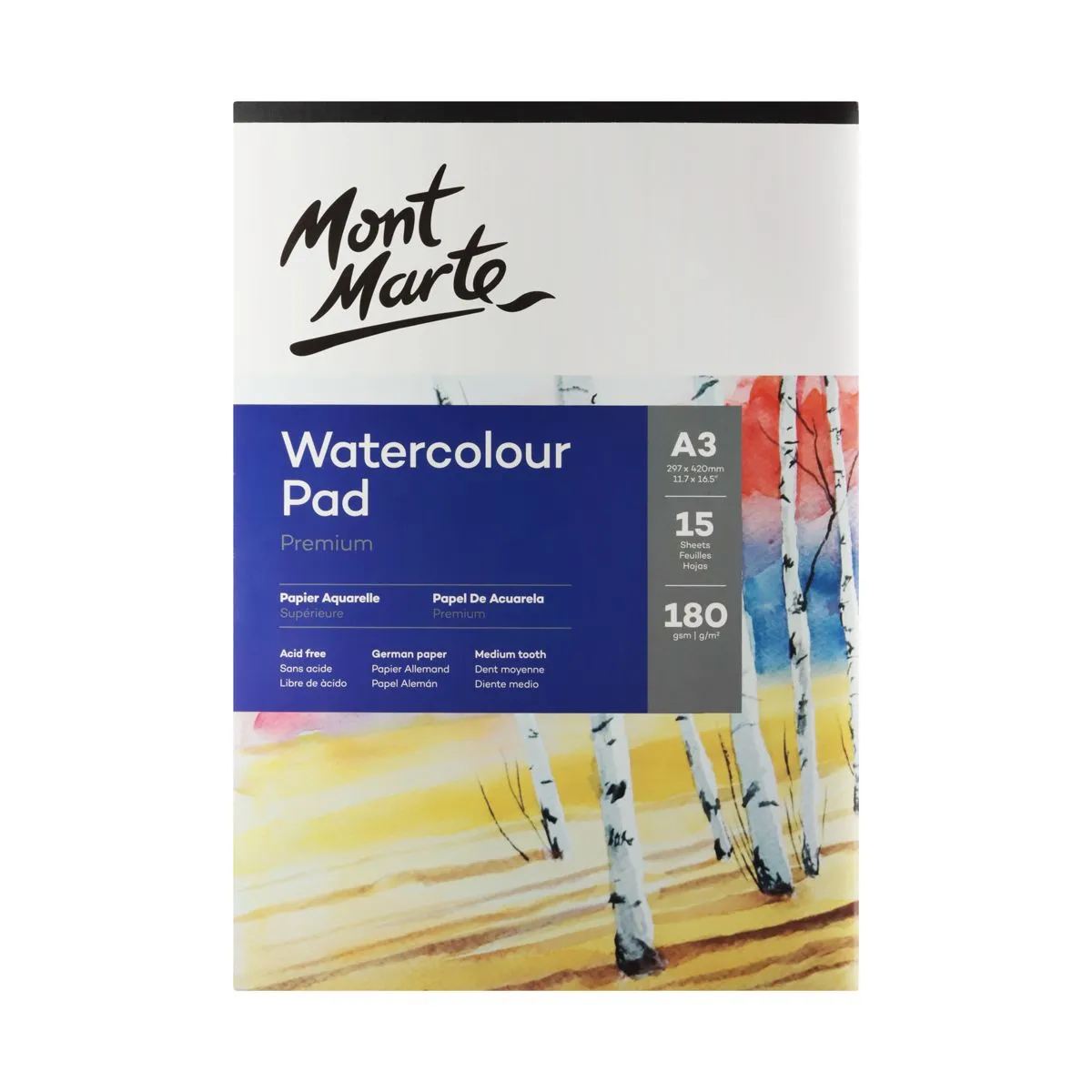 Mont Marte Watercolour Pads have 15 sheets of 180gsm, acid-free, german paper with medium tooth textured paper.