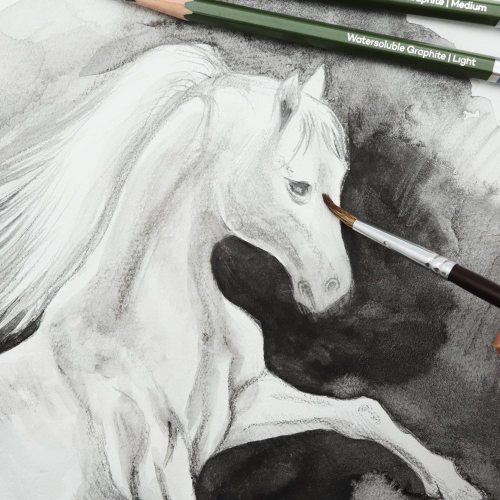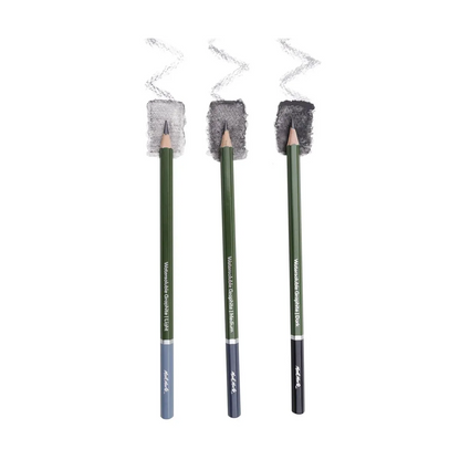 Set includes 3 water-soluble graphite pencils (light, medium, dark), a sharpener, and paintbrush.