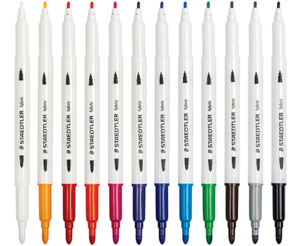 This Staedtler Double-Ended Fabric Marker set comes with 12 double-ended fabric markers in assorted brilliant colours. Capable of creating both fine and ultra fine marks onto fabric for maximum versatility, these pens have a rich colour application and are suitable for most natural dark or light fabrics. They are perfect for hobbyists wanting to personalise and decorate clothing, fabric bags, hats and so much more!