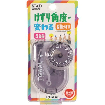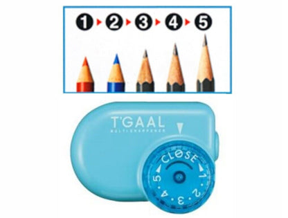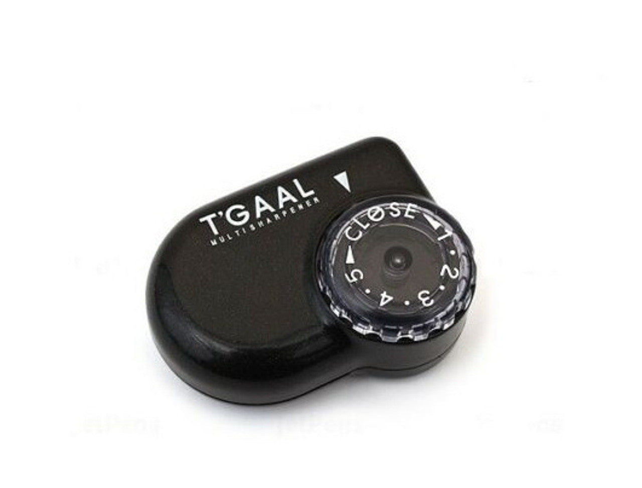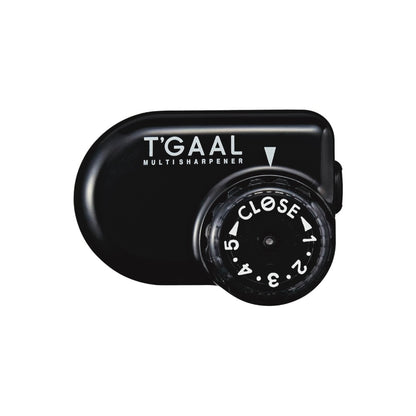 The Stad T'Gaal features a unique dial mechanism that lets you choose between five sharpening angles from 1 (shortest) to 5 (longest). It also has a "Close" setting that shuts the pencil opening to keep shavings from falling out.
