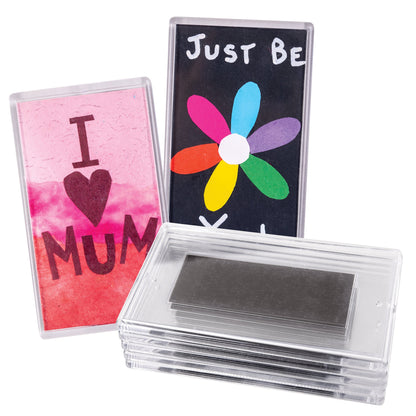 Easily display and protect your cherished artwork with these convenient Magnetic Clear Plastic Frames. With a size of 7 x 12cm, these frames are ideal for showcasing small photographs, drawings, affirmations, or other keepsakes. Simply remove the plastic insert to swap to insert artwork and close to secure. The magnetic backing makes it simple to secure to metal surface for easy displaying. Perfect for DIY gifts, these frames are a thoughtful and customizable option for occasions like Mother's Day, Father's Day, Christmas, or birthdays. Preserve your treasured memories and create unique, personalised gifts with these versatile Magnetic Clear Plastic Frames.